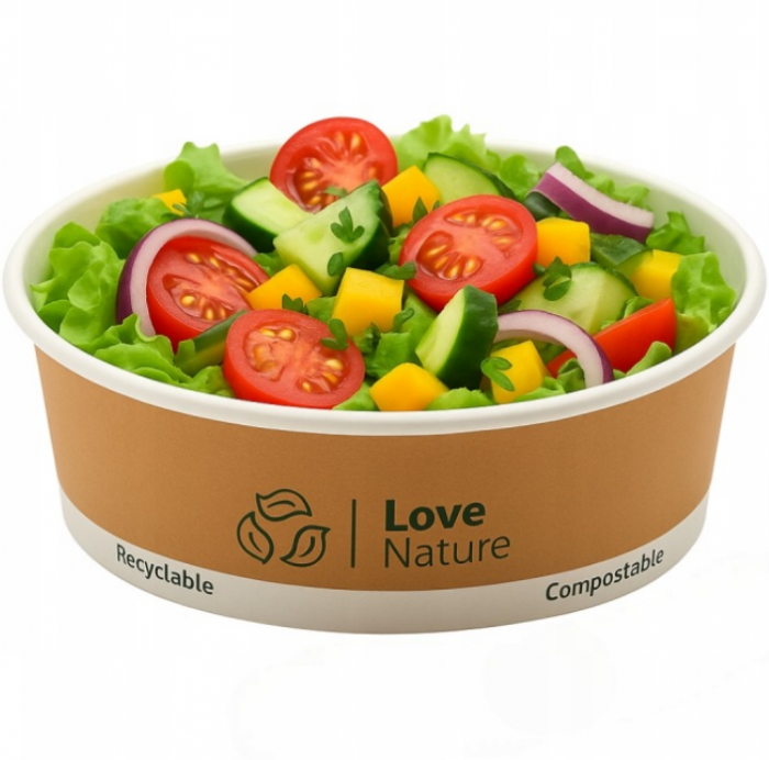 Ekologiczna miska sałatkowa wykonana z wysokiej jakości papieru kraft to idealne rozwiązanie dla nowoczesnej gastronomii, która stawia na zrównoważone opakowania i ograniczenie plastiku. Produkt w 100% pozbawiony jest tworzyw sztucznych, dzięki czemu doskonale wpisuje się w aktualne trendy proekologiczne oraz rosnące oczekiwania klientów dotyczące odpowiedzialnego pakowania żywności.